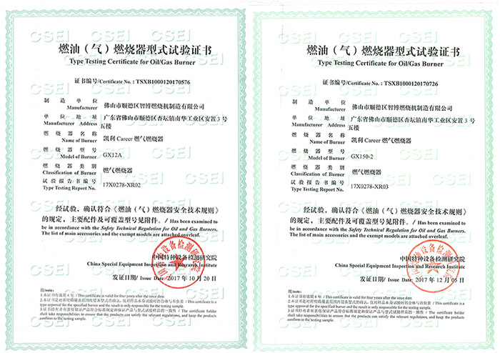 燃油(气)色多多视频污器的型式试验证书是对应产品的安全证书,只有取得了型式试验证书,才能投入使用。